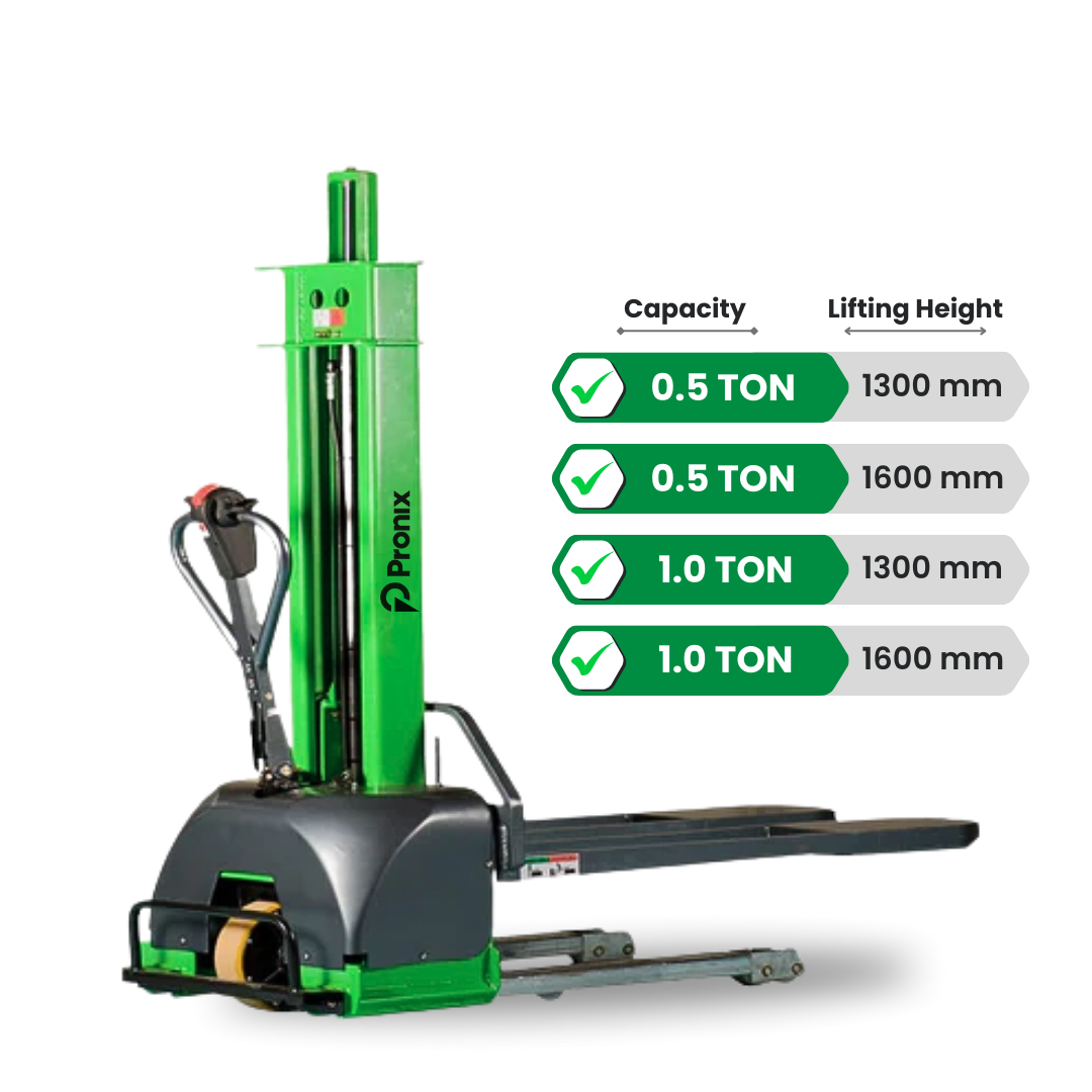 - Pronix Fully Electric Self Loading Stacker 1000Kg with Lifting Height 1.3m PNXFESLS-1013 is a highly durable and powerful stacker suitable for various commercial purposes.