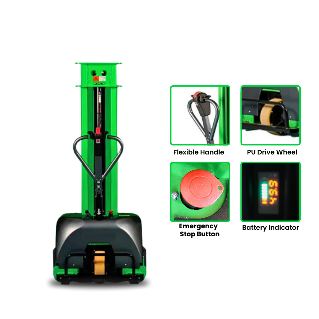 Built with a walking-type operation and robust wheel design, this stacker offers excellent maneuverability and control in tight spaces. Its DC-powered drive and lift motors deliver consistent performance, while the 15 Ah lithium battery ensures energy efficiency and long operational life.