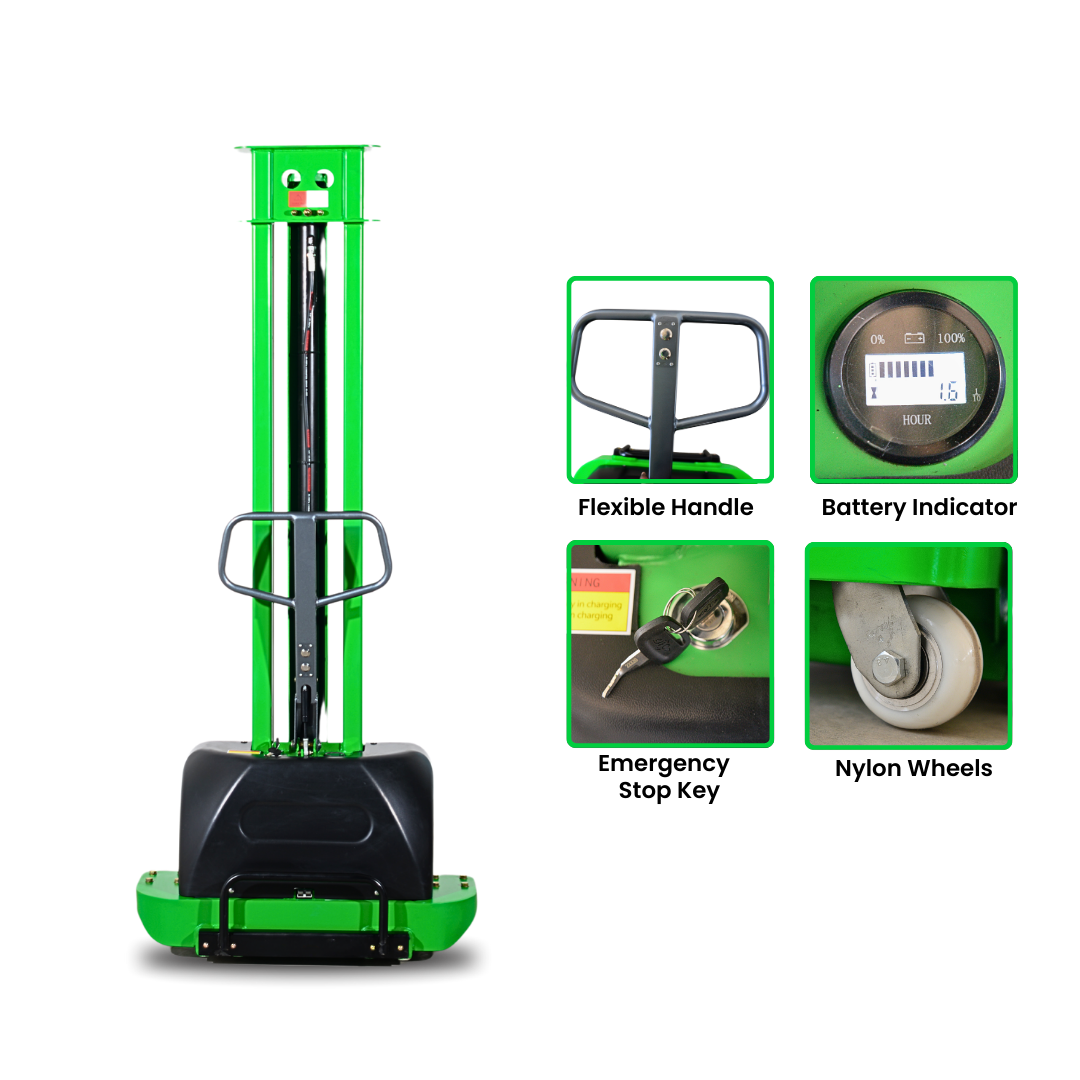 - This stacker is equipped with a 500Kg capacity, 500mm load center distance, and a lifting height of 1.6m, making it ideal for commercial and industrial applications.